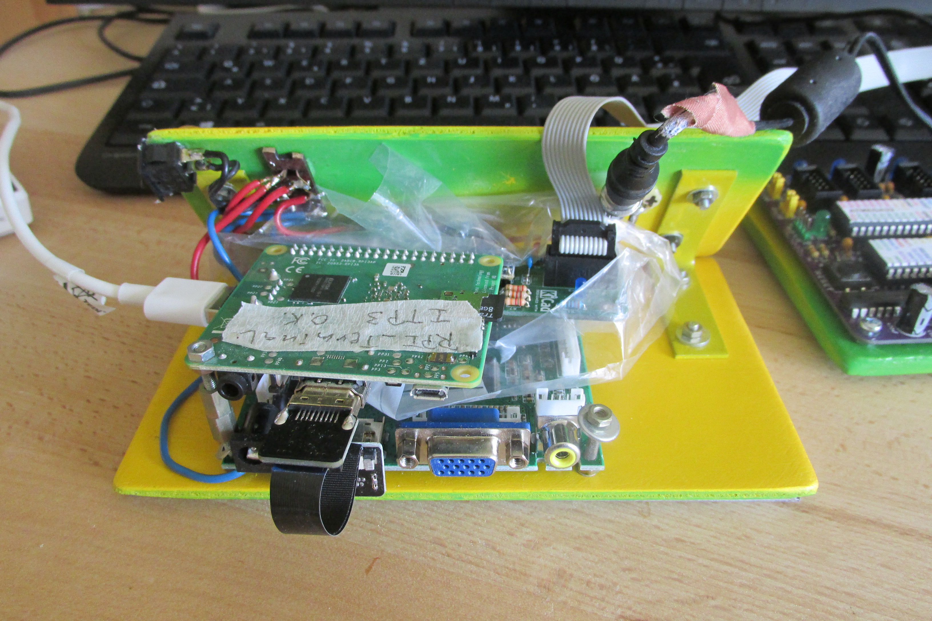 Das 7 Zoll LC-Display wurde auf auf eine kleine Sperrholzplatte mit beidseitigem Klebeband aufgeklebt. Auf der anderen Seite der Sperrholzplatte wurde das LCD-Ansteuerungsboard befestigt. An ein Distanzstück dann den Raspberry PI 3A+ anschrauben.